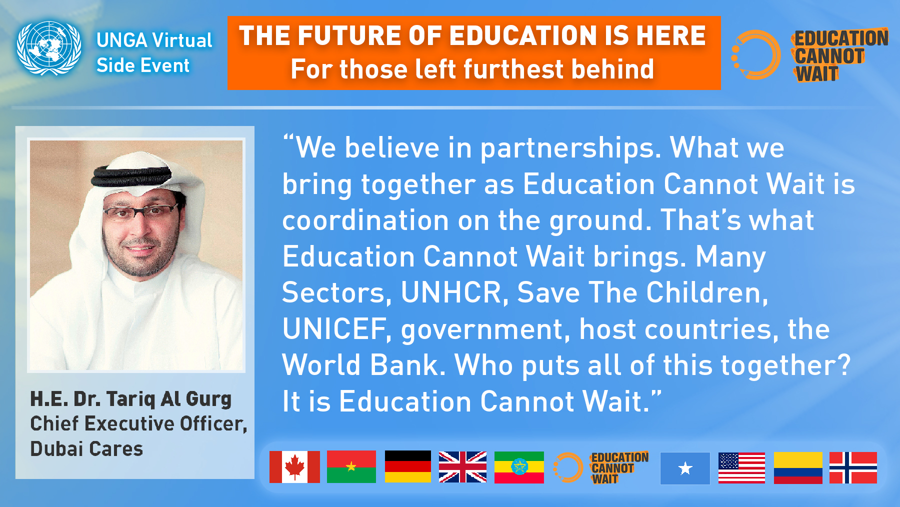 Education Cannot Wait brought together an impressive, diverse line-up of world leaders, policymakers, youth, teachers, celebrities and global advocates to rally around the cause of education in emergencies and protracted crises during the 75th Session of the United Nations General Assembly under the inspiring theme “The Future of Education is Here for Those Left Furthest Behind.”