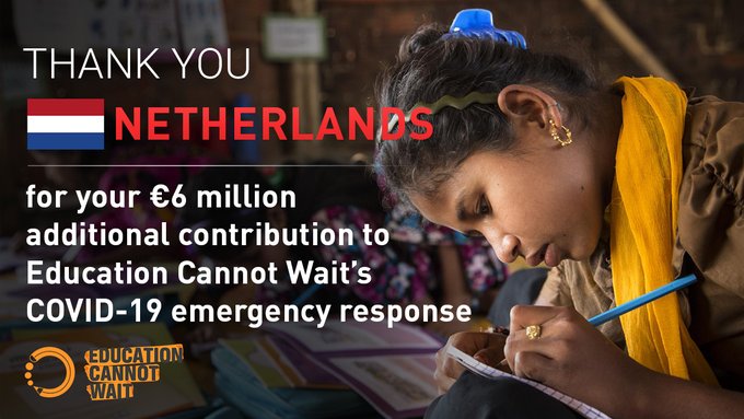 #ECW warmly welcomes this new, additional contribution by #Netherlands to our #Covid19 education in emergency response! “We appreciate ECW's intersectoral approach and emphasis on mental health and psychosocial support." ~ @SigridKaag @DutchMFA @NLatUN @YasmineSherif1 @UN