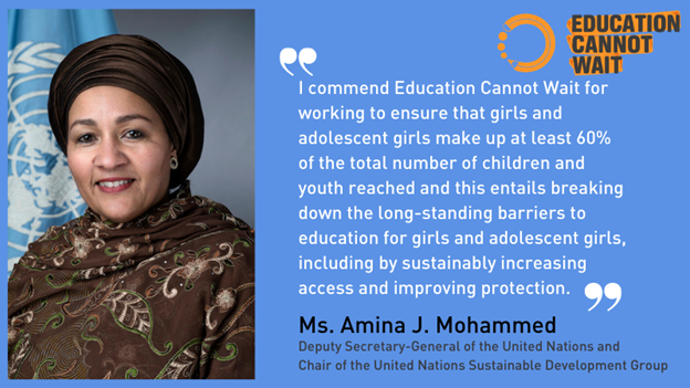 In her remarks at the ECW High-Level Steering Group meeting, UN Deputy Secretary-General, Amina J. Mohammed, expressed her support for ECW’s critical work for the millions of children and youth whose education is disrupted by conflict, disasters and other crises. “Education Cannot Wait is an example of how the United Nations system delivers quality with speed to advance Sustainable Development Goal 4 leveraging the best from across the UN family.”