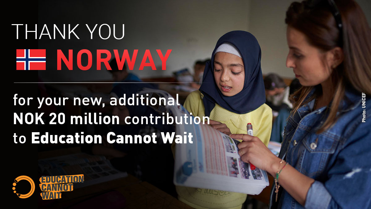 #ECW warmly welcomes this new additional contribution from #Norway! This will assist ECW & partners to reach crisis-affected children & youth caught in armed conflicts, forced disasters, natural disasters - now doubly hit by #Covid19 - with quality education! @dagiulstein