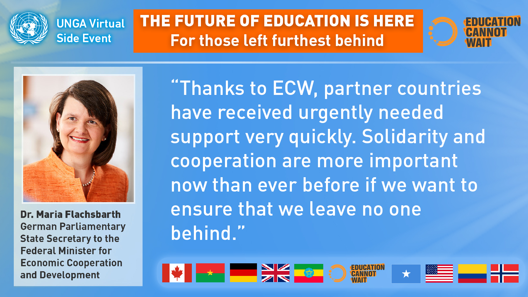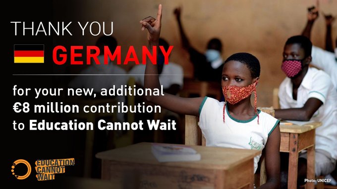 #ECW warmly welcomes this new additional contribution from Germany! This will assist ECW & our partners to reach crisis-affected children and youth - now doubly hit by #Covid19 - with quality education! @BMZ_Bund @GermanyUN @GermanyUNGeneva @YasmineSherif1 @GermanyDiplo
