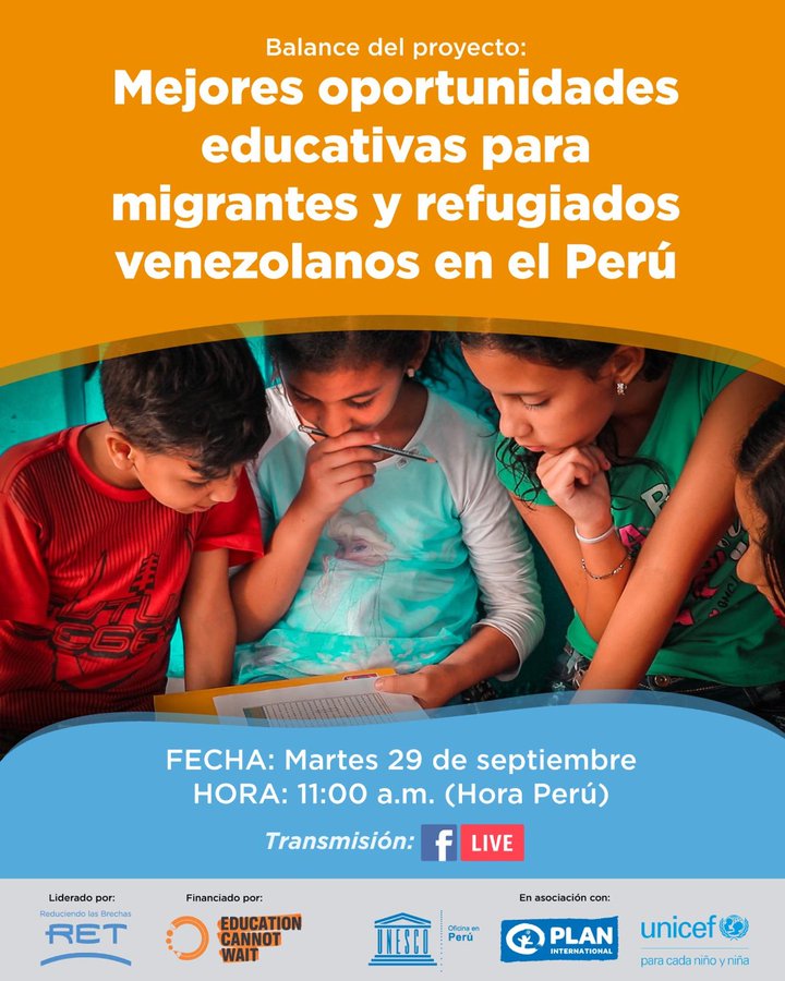 #HOY #RET, con el apoyo de @EduCannotWait, y en asocio con @UnescoPeru, @UNICEFperu y @planperu, presentará el balance del projecto “Mejores oportunidades educativas para migrantes y refugiados Venezolanos en el Perú”. Sigue la Transmision a traves del facebook de #UNESCOPeru.